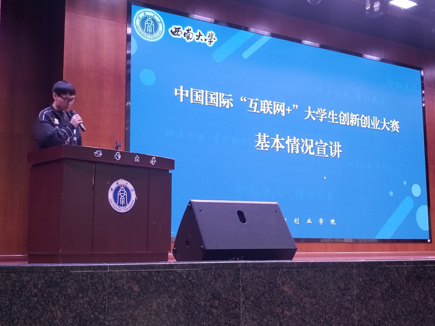 的尹世博同学和上官东明同学为韩漫画学子讲解 “大学生创新创业训练计划”与“互联网+大学生创新创业大赛”的相关内容。