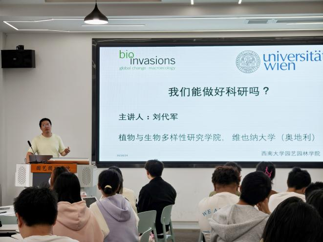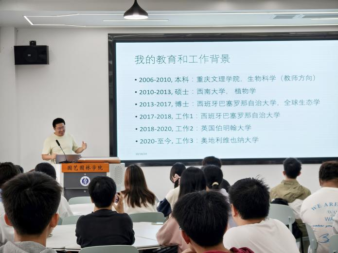 领导和老师的指导与帮助。随后他介绍了自己的研究方向,多年来致力于气候变化和土地利用变化对生物多样性及生态系统功能研究并取得重要科研成果。他提出对当前科研环境的见解,并对学生们在科研道路上可能遇到的困难提出宝贵建议。