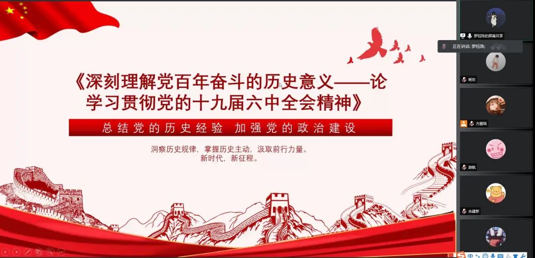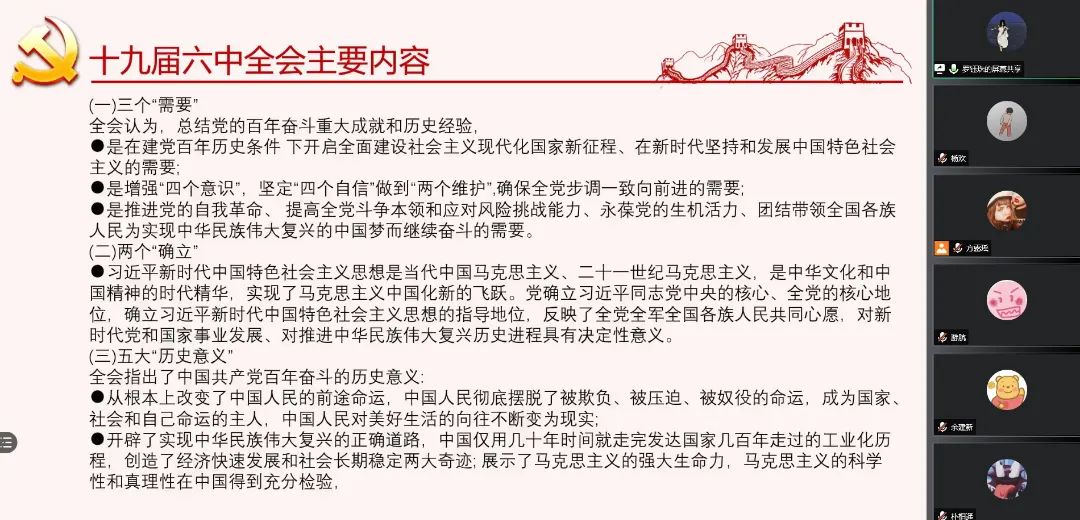 会议议程第二项为回顾历届六中全会,此次会议回顾了自1981年6月27日至29日召开的十一届六中全会一直到2011年10月15日至18日召开的十七届六中全会。在讲解员的解说下韩漫画团委学生会全体人员认真聆听历届六中全会主要议题,深入学习其背后的精神。会议议程第三项为观看相关视频并邀请学生代表发言,会议中全体人员观看了十九届六中全会的相关解说视频,并邀请韩漫画团委学生会工作人员陈煜琳、安林灵两位同学就观看视频“十一届六中全会召开历史意义”发表自己的感想,他们提到在此次线上会议的学习加上视频的讲解,深刻体会到十九届六中全会在中国发展史中的重要意义,对会议精神也有了自己更加深刻的理解。