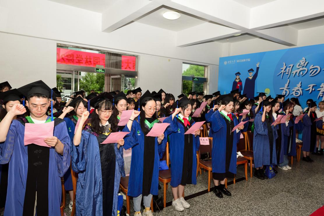 学生代表曹刘明领誓,全体学位获得者庄严宣誓,誓不负师长教诲母校培养,誓不负国家期许社会期望。学术委员会委员及教授代表为学位获得者授予学位并进行拨穗仪式。