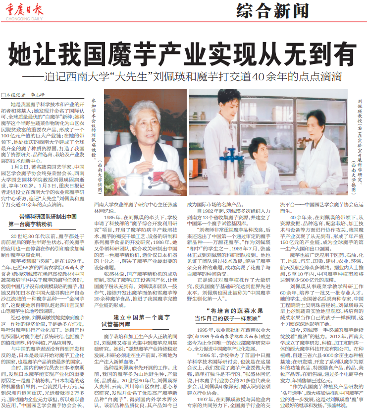 ,以《她让我国魔芋产业实现从无到有》为题,追记“大先生”刘佩瑛和魔芋打交道40余年的点点滴滴。全文报道如下: