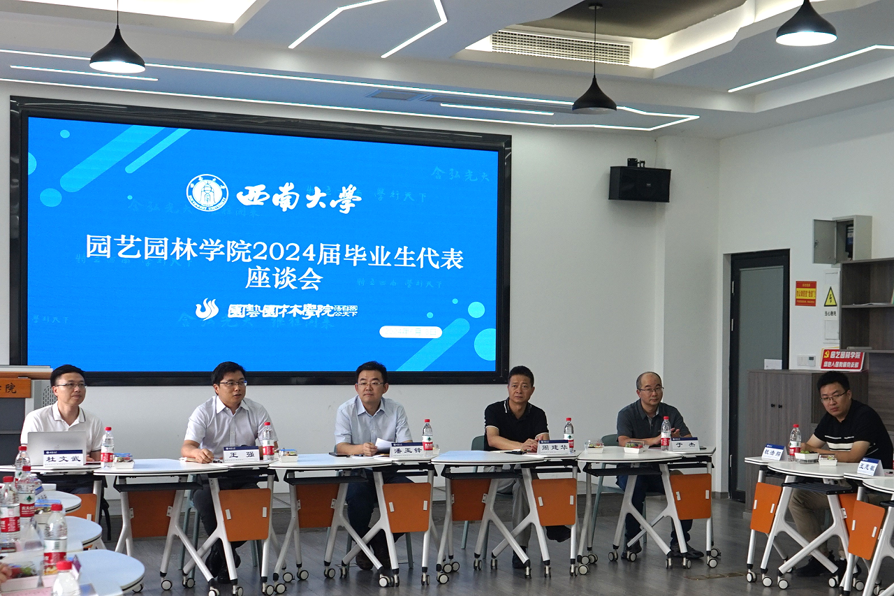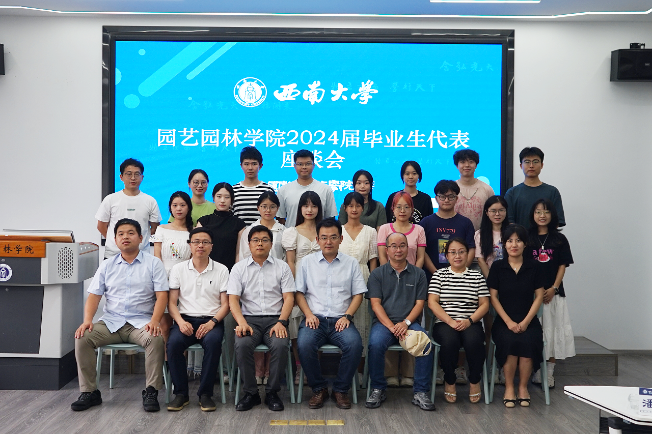 党委书记潘玉锋,党委副书记王强,副院长周建华,风景园林系主任杜文武,植物系主任于杰,园艺系副主任高启国,教务办主任祝浩翔,学工办主任谭泽轩,班主任代表王志敏,辅导员邓珍珍、金云鹤、吴超出席座谈会,2024届本科、研究生毕业生代表近20人参与座谈。会议由王强主持。