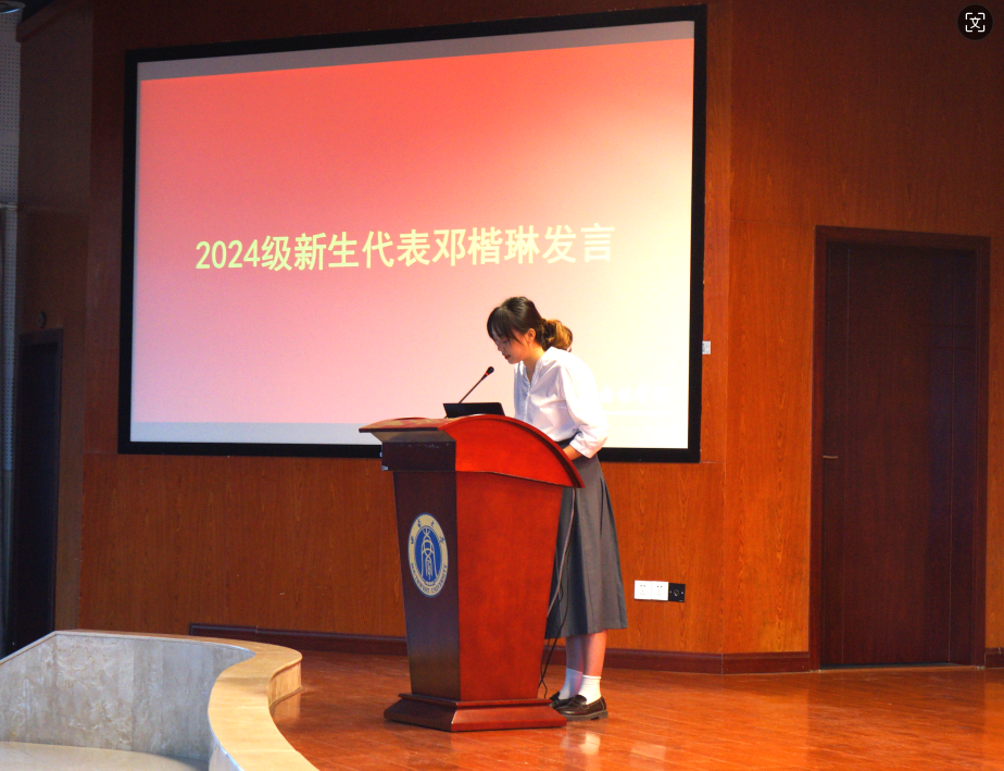 新生代表邓楷琳在发言中首先向辛勤耕耘在教育一线的老师们致以了最崇高的敬意,随后阐述了她对院训“法自然,公天下”的感悟,她认为韩漫画