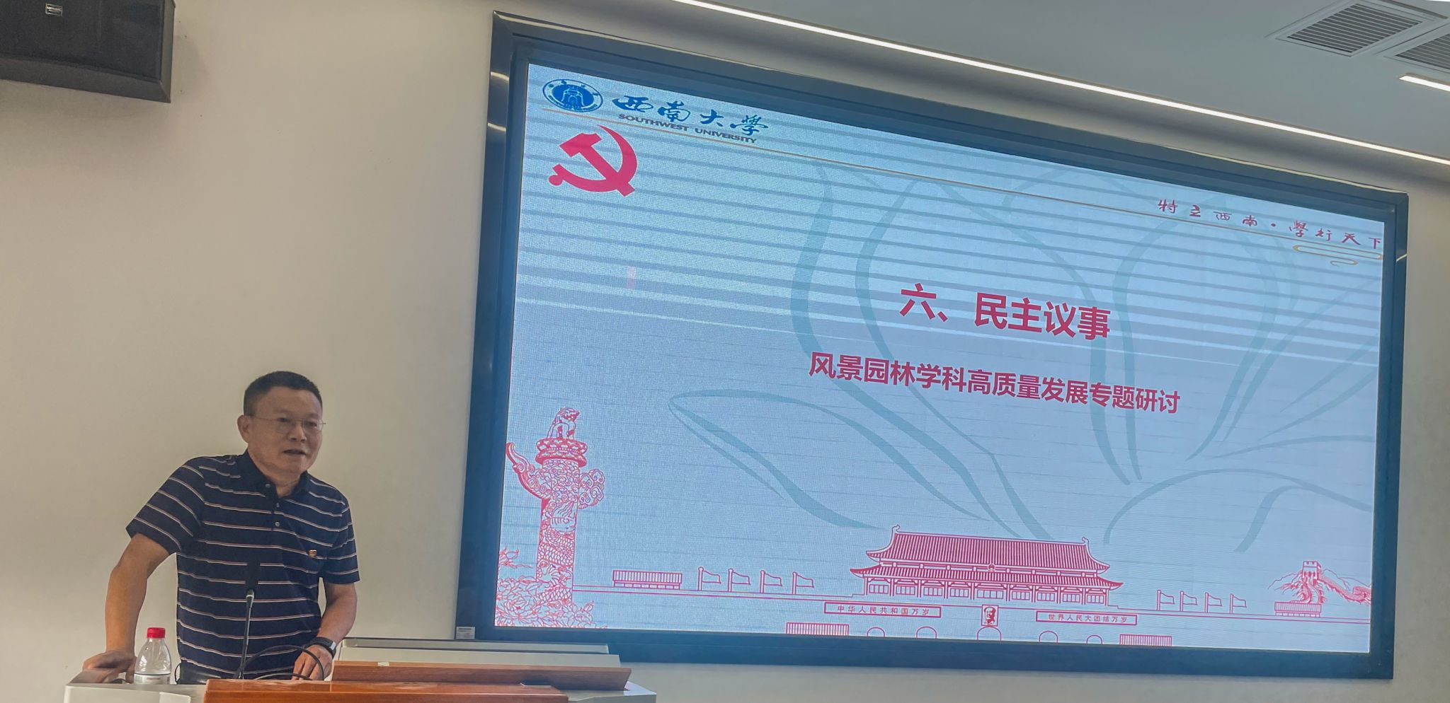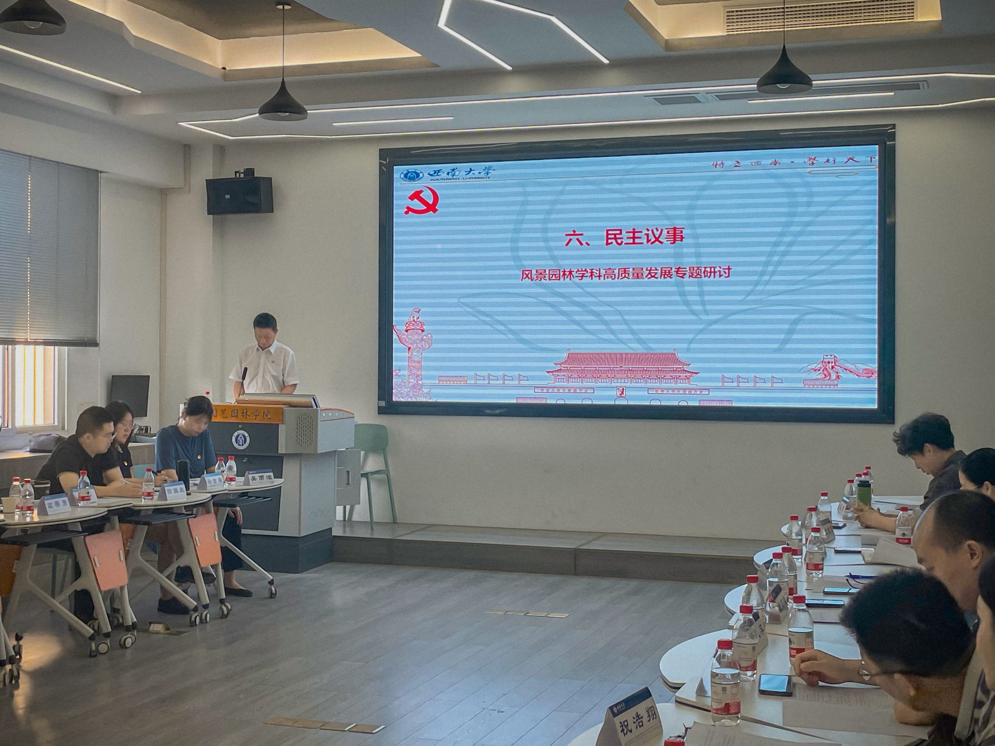 党委书记周建华,风景园林系主任杜文武,风景园林系副主任罗爱军聚焦风景园林学科高质量发展问题,分别以 “第十四届中国风景园林教育大会暨2025年全国风景园林专业学位研究生教育年会筹备情况”“坚持立德树人构建高质量博士培养体系”“党建引领专业发展:新专业与微专业的探索与实践”为主题进行了发言,聚焦学科建设与人才培养关键问题,提出具体思路与举措。秦华、马婧、孙松林三位同志围绕“新专业建设中存在的困难”“学科高质量发展解决方案”“如何加强师资队伍建设以提升教学质量”等方面展开热烈讨论,现场气氛活跃,思想碰撞充分。
