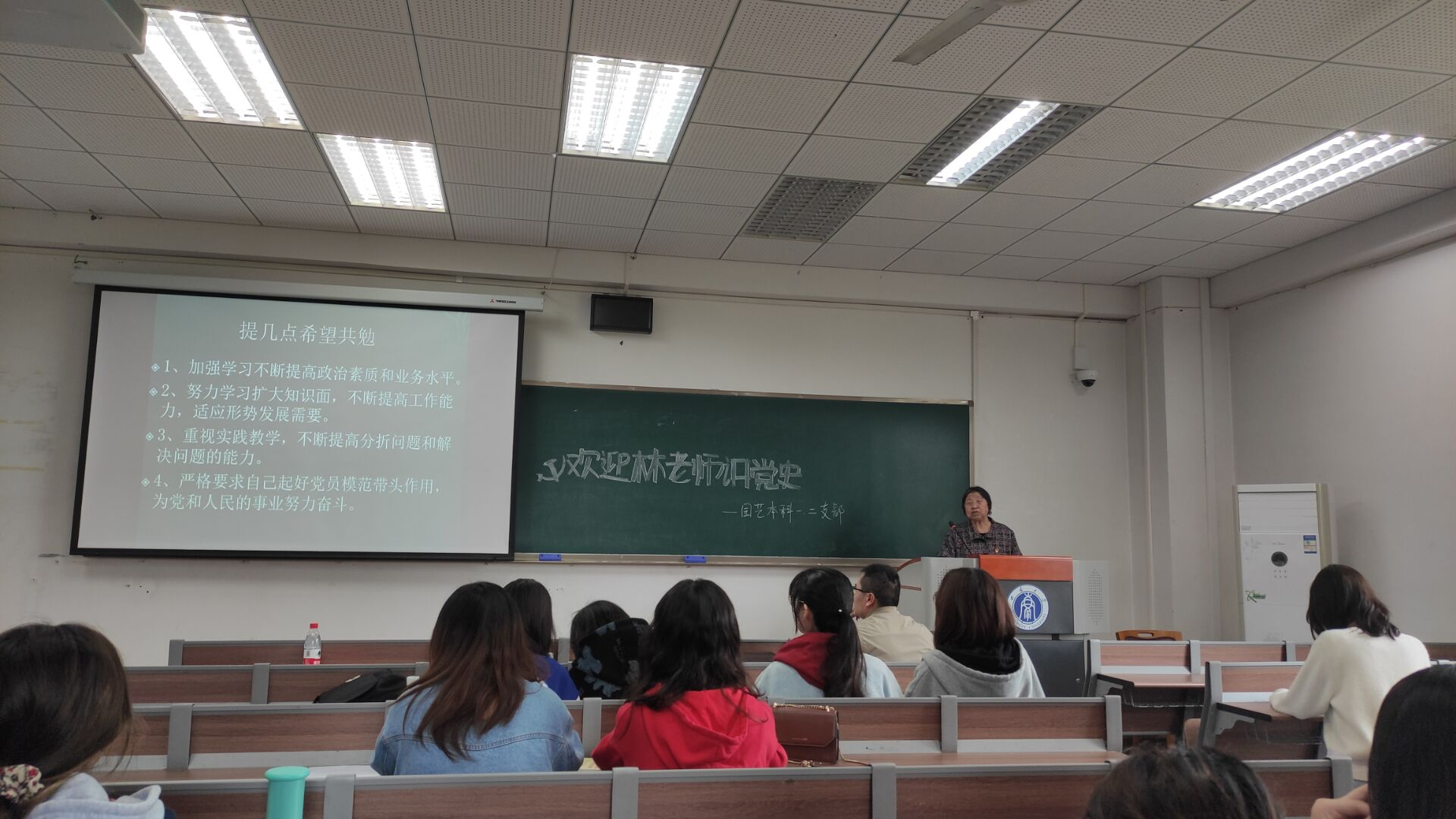 ,并在毕业后留校任教。在校蔬菜教研室从事蔬菜栽培技术教学和推广的38年间,林老教授始终跟随着共产党的脚步,始终以党员标准严格要求自己。1984年入党以后,林德清先生更是学在深处,干在实处;2000年后,林教授退而不休,情系三农,深入农村,将农业知识传播到了石柱、广安、巫山等25个区县,帮助农民们脱贫致富,至今仍奔跑在扶贫攻坚一线,其几十年如一日的坚守深深打动了在座党员。最后,林德清教授向支部内党员们提出几点希冀——一是提高政治素养;二是增强专业水平;三是重视实践劳动;四是引领党员模范。