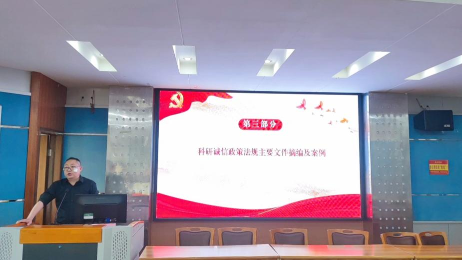 随后,副院长郭启高为各位老师讲解科研诚信政策法规主要文教摘编及案例。郭启高从政策导向和规章制度出发,通过案例分析,倡议各位老师追求真理、诚实守信、砥砺进取,做学术规范的捍卫者和科技创新的探索者。