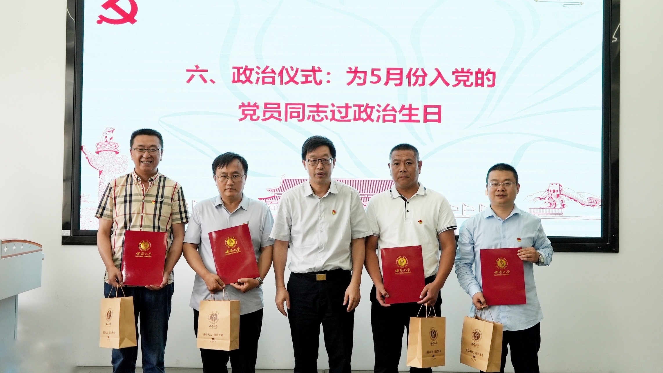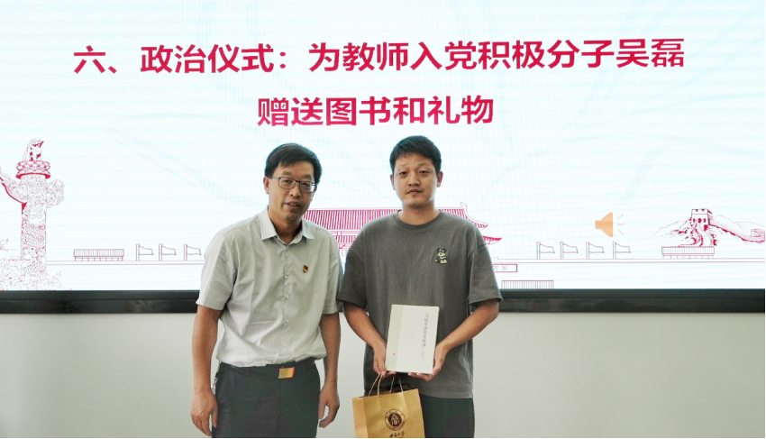 随后,党支部为5月份入党的刘海利、任雪松、牛义和景丹龙4位党员同志庆祝了政治生日。任雪松作为一名有着29年党龄的老党员,重温了自己入党志愿书内容,回顾了自己入党的初衷,分享了自己在党的旗帜下努力工作、教书育人的情况。赵国华为4位党员送上政治贺卡,同时,还为自己联系的教师入党积极分子吴磊赠送了图书。