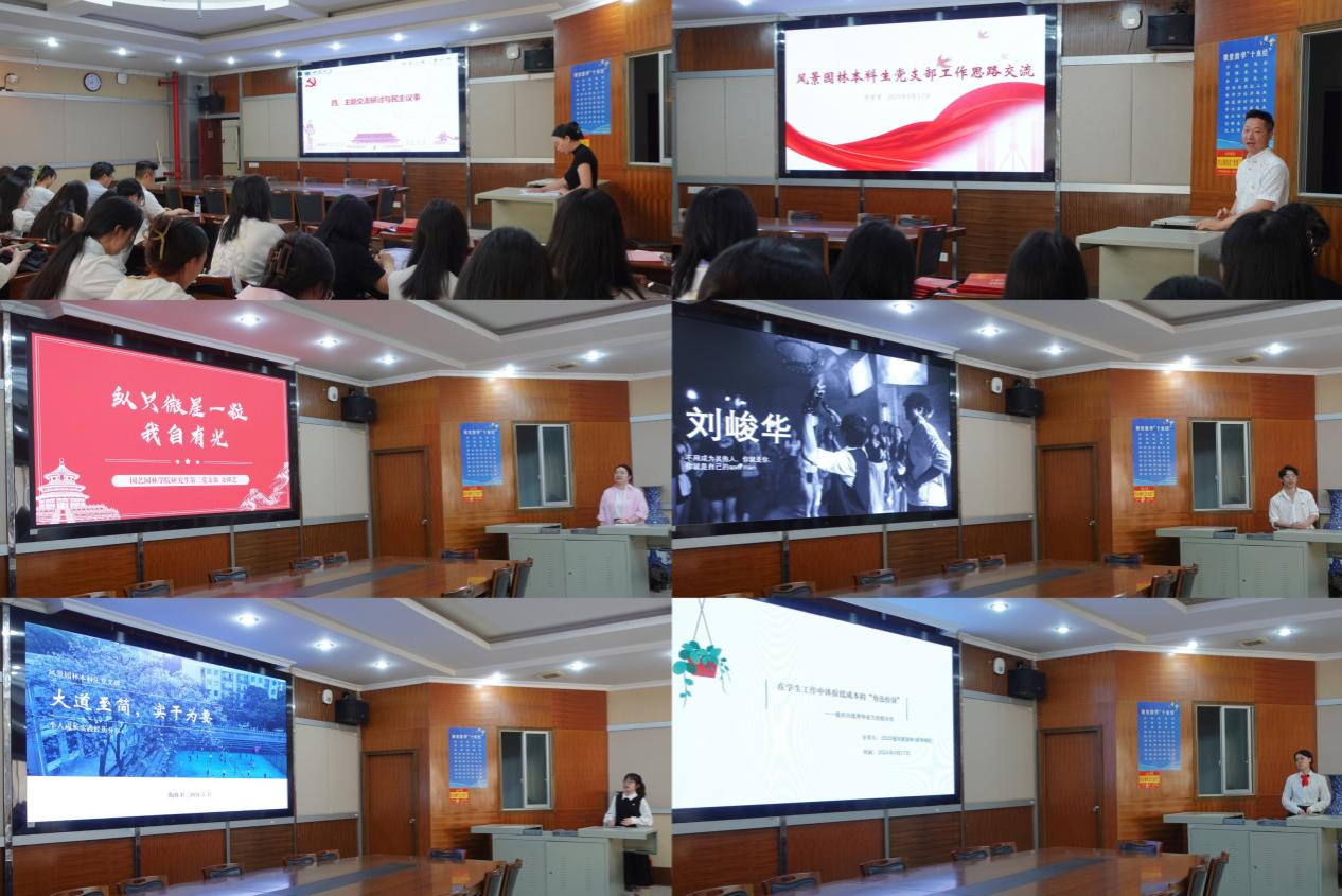在主题交流研讨与民主议事环节,研究生第三党支部书记张靖悦、风景园林本科生党支部书记罗爱军围绕“党支部的使命愿景是什么”和“学生党支部如何为培养一流人才发挥战斗堡垒作用”作主题发言。2024届重庆市普通高校学生先进个人余隆艺、刘峻华、陶姝羽和毕铭桧就“学生党员如何争做有理想、敢担当、能吃苦、肯奋斗的新时代好青年”作了主题分享。