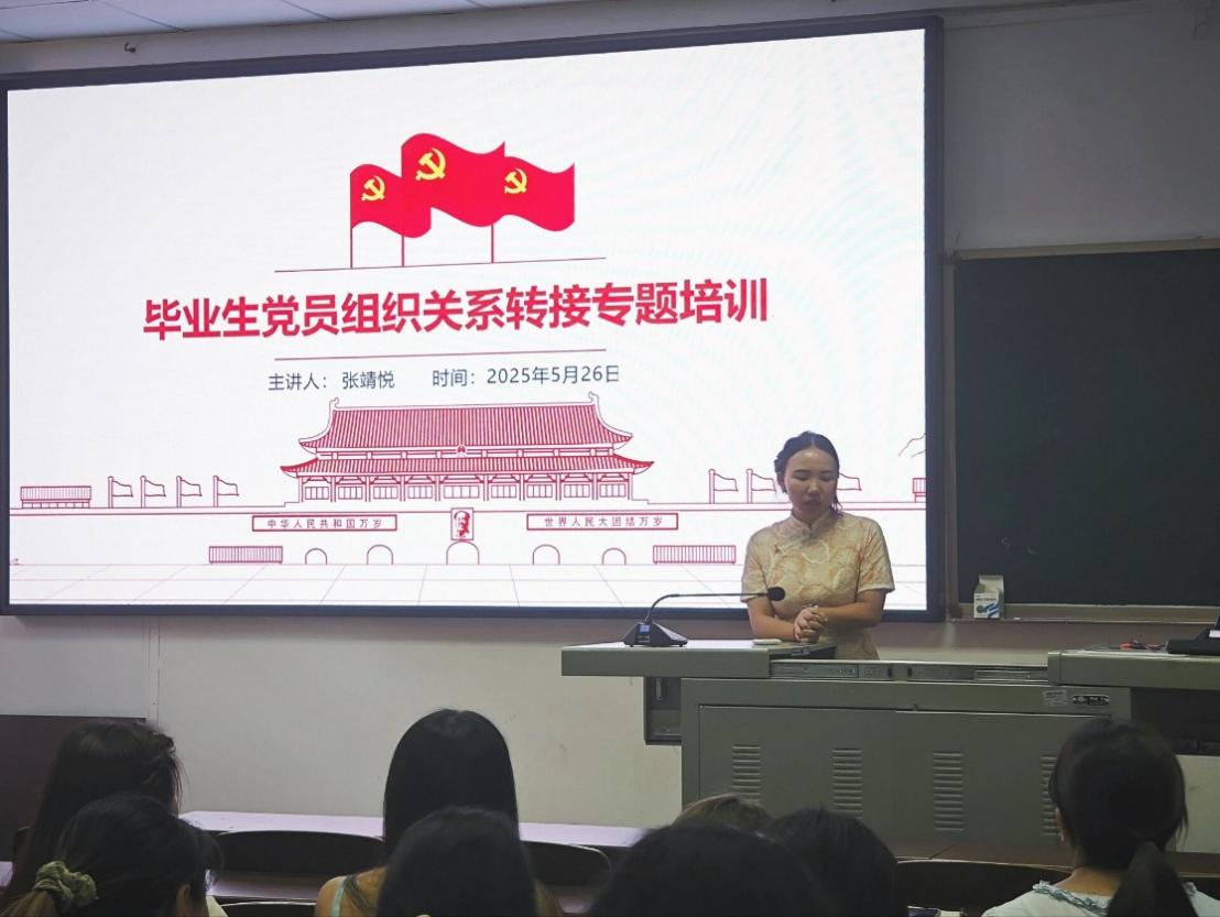 专职组织员张靖悦围绕《毕业生党员组织关系转接实施办法》,为全体毕业生党员开展专题培训。她详细讲解了党组织关系转接的流程、注意事项及政策依据,强调组织关系转接是党员政治生命的重要环节,要求毕业生党员主动跟进、及时落实,切实增强组织纪律观念,确保顺利完成组织关系转接工作。