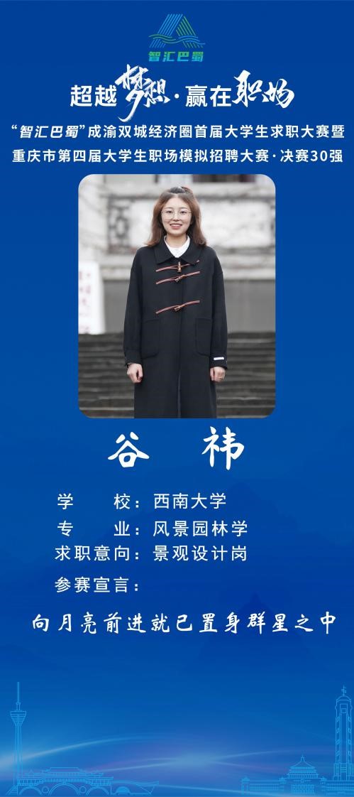 韩漫画2019级风景园林学硕士研究生谷祎同学,因其丰富的实践经历和出色的比赛表现,荣获“智汇巴蜀”成渝地区双城经济圈首届大学生求职大赛暨重庆市第四届大学生职场模拟招聘大赛决赛三等奖,在重庆市近十万名参赛选手中挺进前30强。