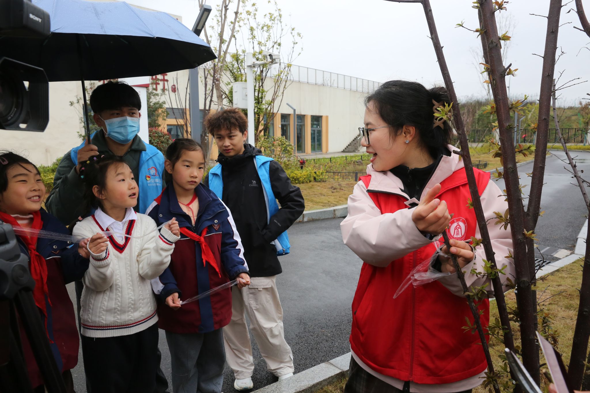 志愿者卢茂林、赵茂伶和尚文俊通过“直播进课堂”的形式为小朋友们带来了一场生动有趣的嫁接小课堂。在报告厅内,小朋友们通过视频直播,一边聆听奇妙的嫁接小知识,一边在镜头下实时观察每一个嫁接步骤。“为什么柠檬和柚子会生长在一棵树上呢?”“为什么要在砧木上切一个小伤口?”......在一问一答的互动中,大手拉小手共同探索嫁接的奥秘。