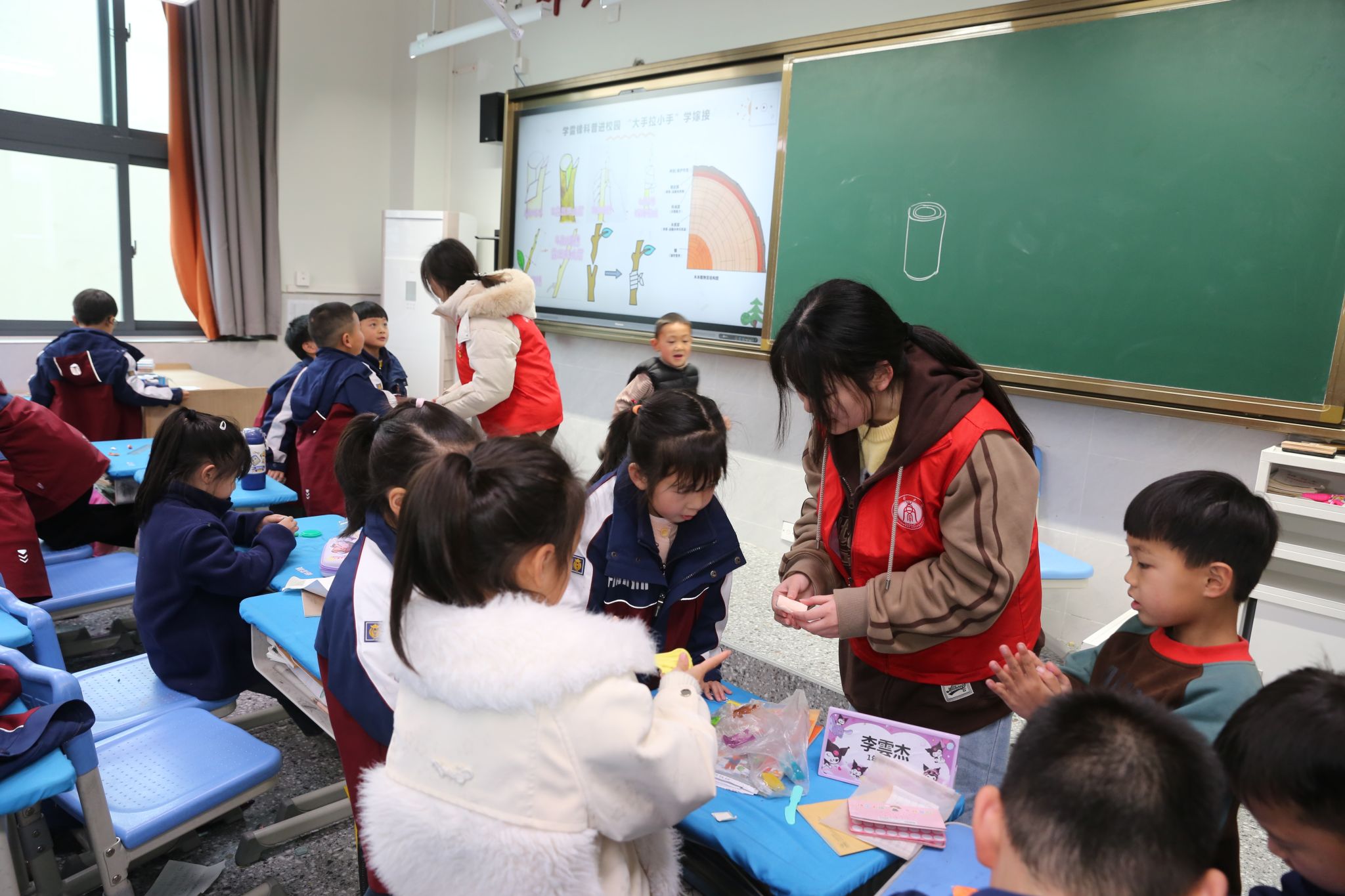 为了让小朋友们对嫁接有更深刻的了解,志愿者们带领他们亲手操作、体验嫁接过程。一、二年级的小朋友们利用不同颜色的橡皮泥发挥想象力,巧妙地捏造出自己心中的“新果树”,在实践中感受嫁接的乐趣;三年级的小朋友们在志愿者指导下化身“植物医生”,尝试用嫁接膜将砧木和接穗进行固定,自豪地展示自己的嫁接成果。