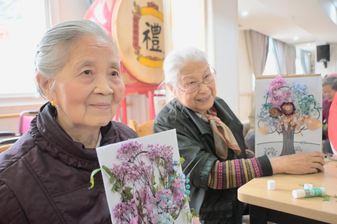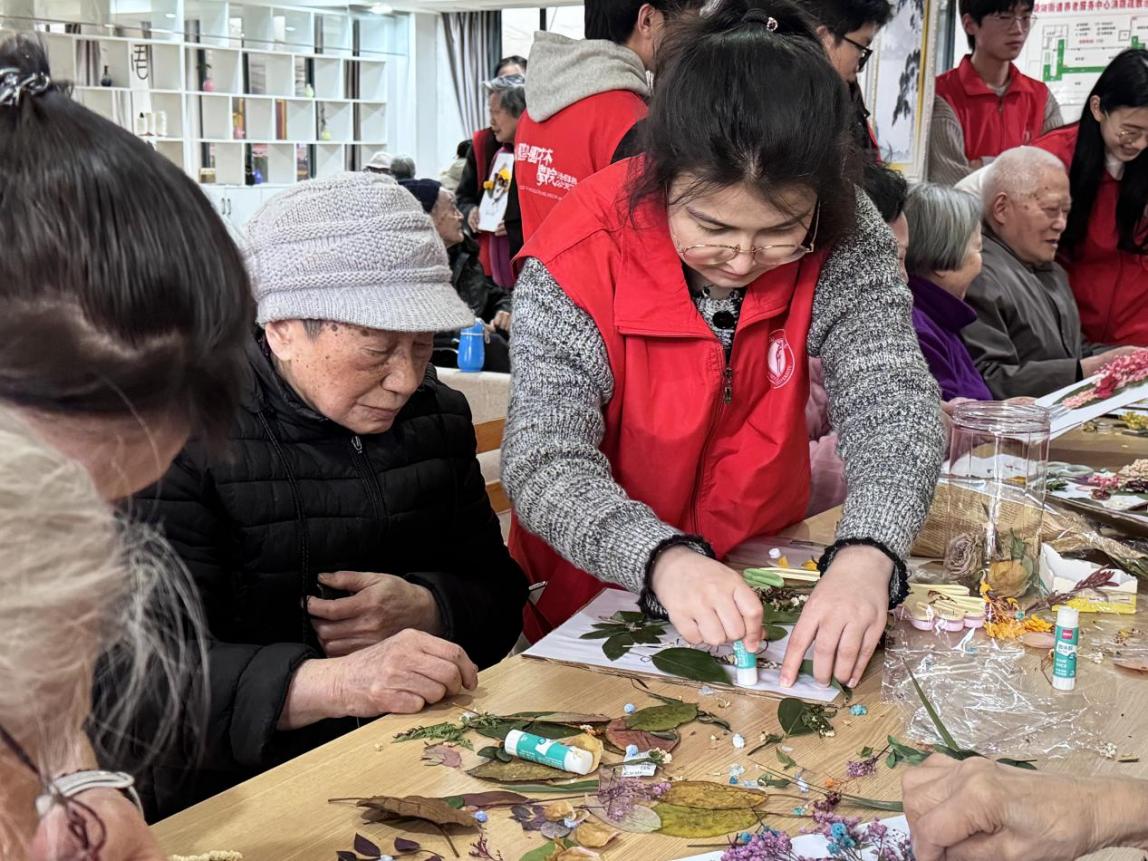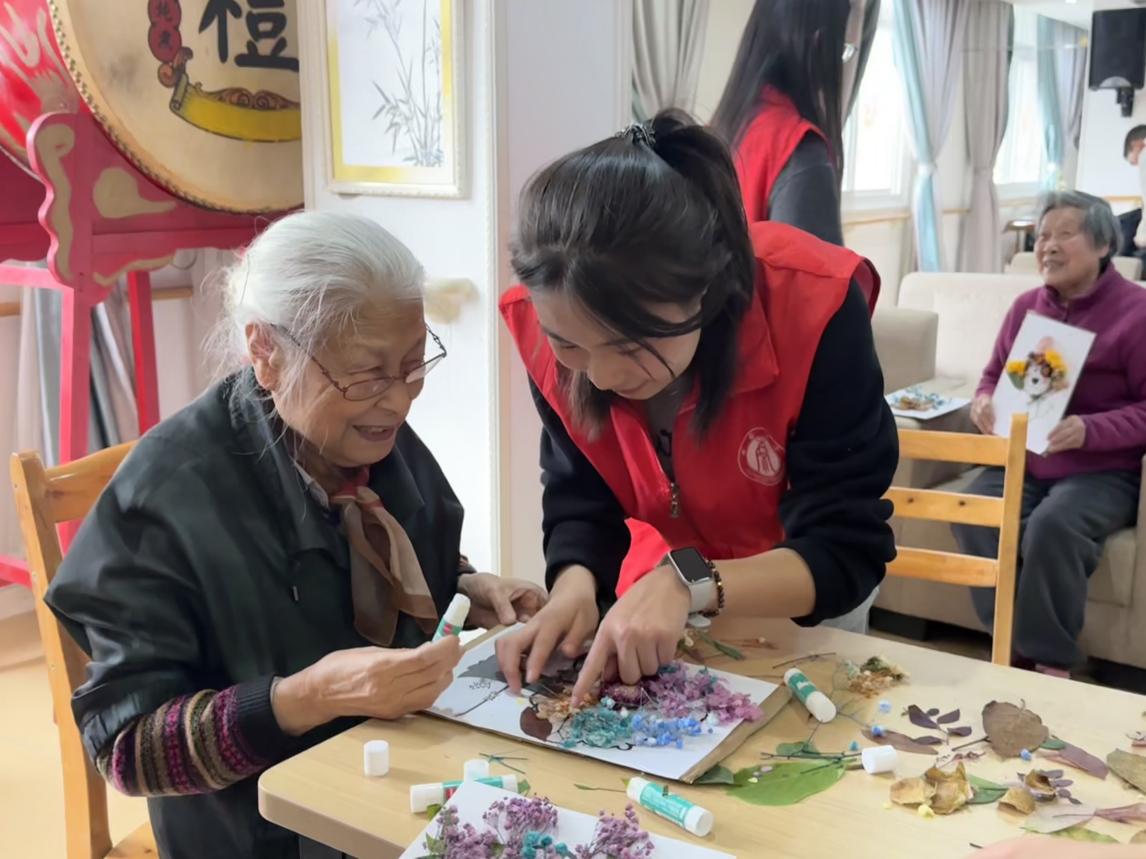 植物贴画创作环节更是温情满满。团支部提供带有模板的硬纸板和半成品植物材料,同学们与老人结成对子,共同发挥创意,将五彩斑斓的干花、形态各异的叶片化作艺术创作的素材。“爷爷,咱们这里这里贴什么颜色的干花好呢?”“奶奶,这样贴好看吗?”……在亲切的交流中,一幅幅充满生命力的贴画作品陆续诞生。这个环节不仅让老人们体验到手工创作的乐趣,更在代际互动中收获了心灵的温暖。