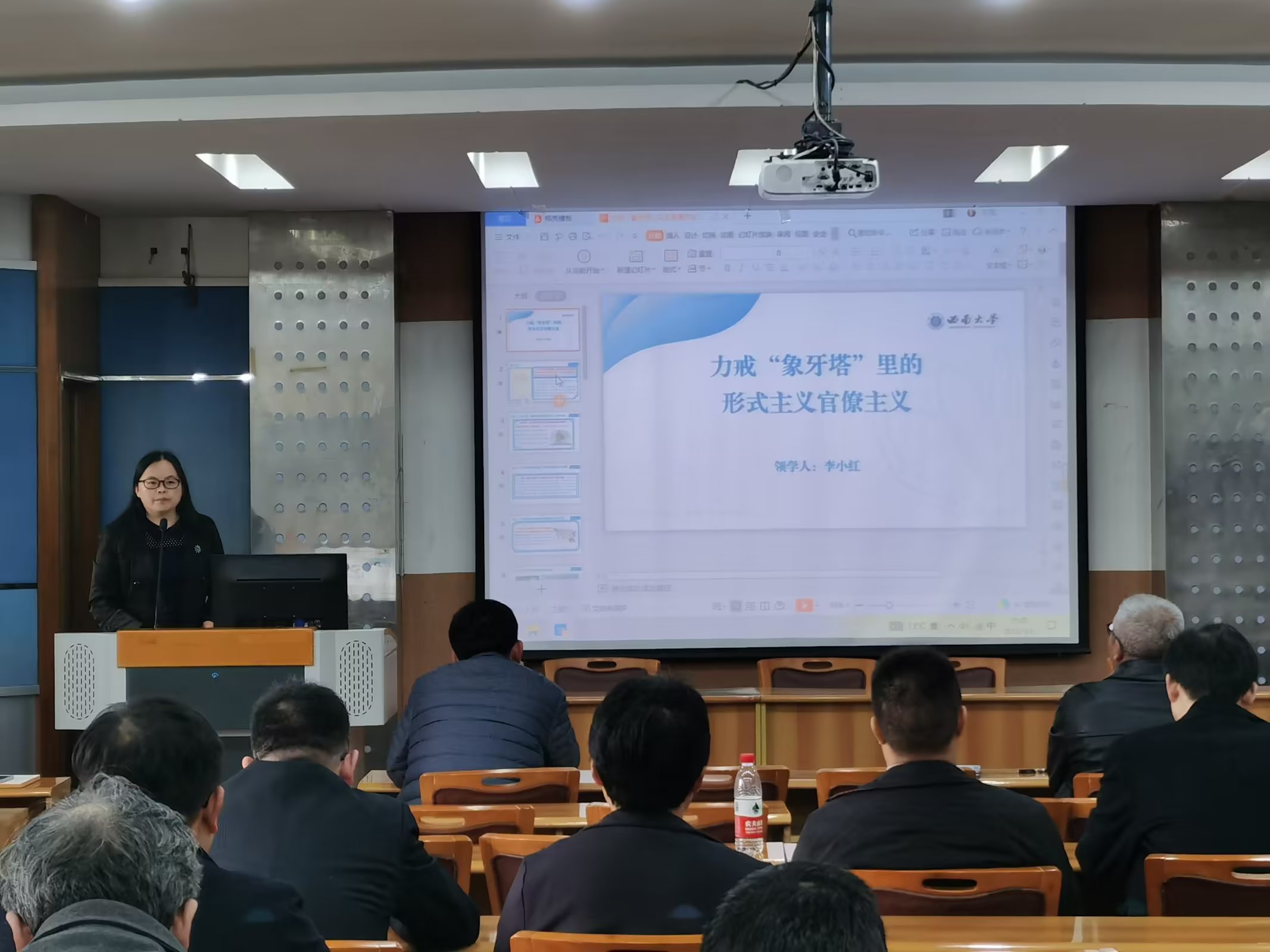 李小红同志从如何认识形式主义、官僚主义切入,全面分析当前主要表现,结合校园里的官僚主义,从 “官气十足,衙门做派”“门户林立,近亲繁殖”“不务正业,攀附结交”“好高骛远,贪图虚名”四个方面,带领参会人员分析了“象牙塔”里的官僚主义的常见现象及其危害。