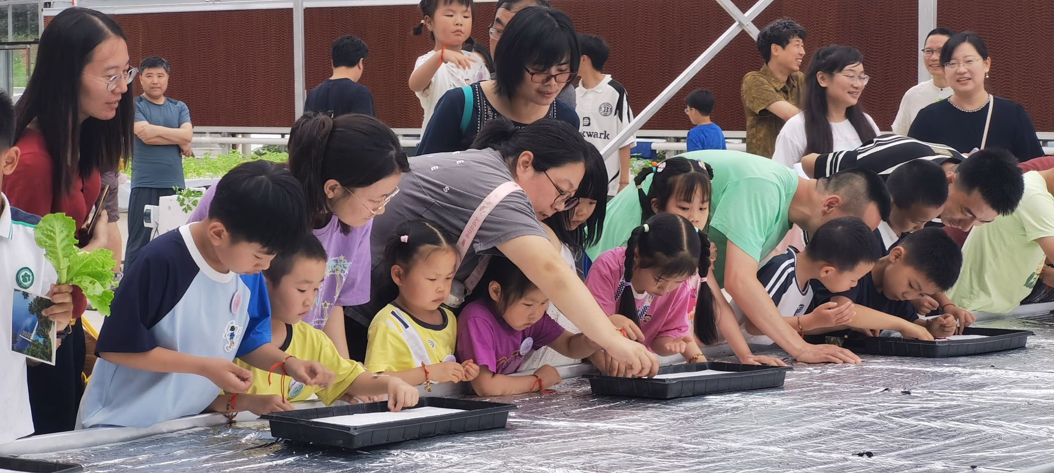 在智慧温室探索环节,刘海利老师引领孩子们走近现代设施园艺技术。近距离观察无土栽培的绿植,孩子们惊叹于科技对农业的革新。小小园艺师体验区更是热闹非凡,孩子们在家长协助下亲手完成水培作物的播种与定植,小心翼翼地将幼苗植入营养液,脸上洋溢着满满的成就感。