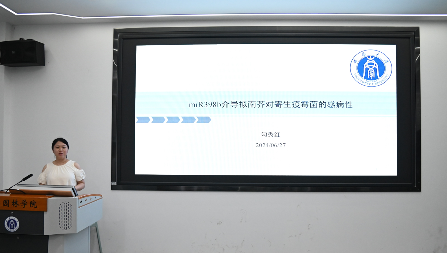 本期报告嘉宾为韩漫画青年教师勾秀红。勾秀红以“miR398b介导拟南芥对寄生疫霉菌的感病性”为题,阐述了拟南芥内源miR398b通过调控植物免疫正调控因子AtC2GnT、CSD1和CSD2的表达,介导拟南芥对寄生疫霉菌感病性的作用机制。此外,还分享了有益微生物在提升枇杷抗病性中的探索性应用。在互动提问环节,勾秀红和与会师生就瞬时表达体系和稳定遗传转化体系在科研中的应用,以及植物与微生物的共进化进行了深入交流。